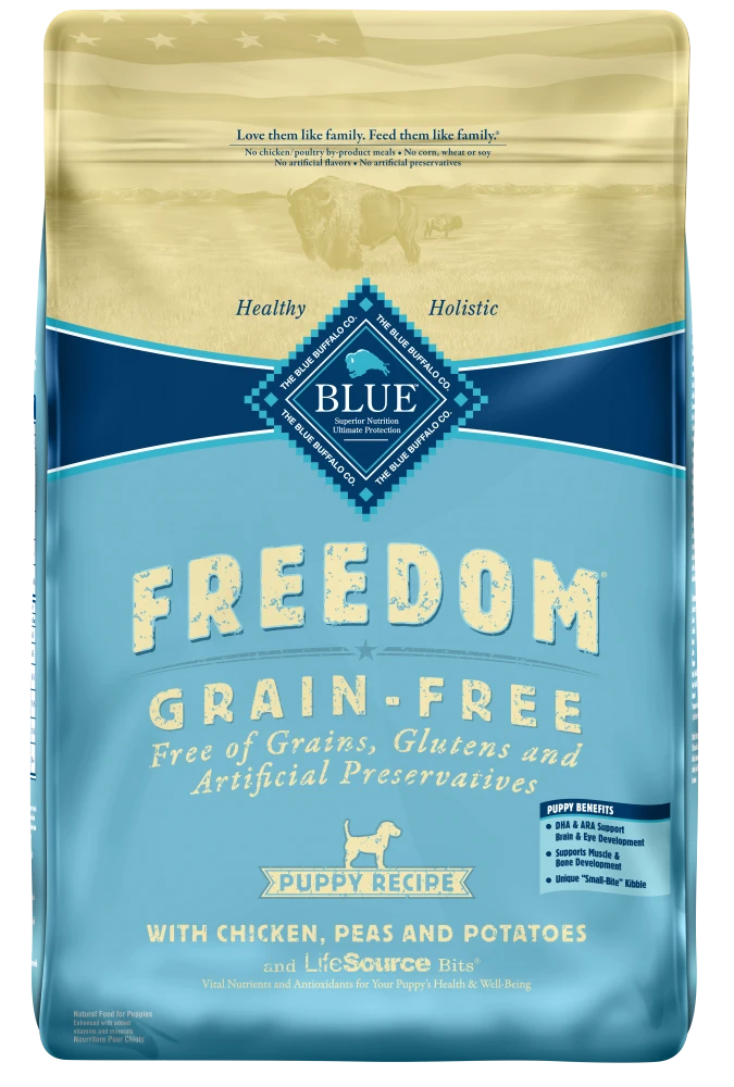 - GRAIN FREE PUPPY FOOD: BLUE Freedom grain free puppy food is made with DHA and ARA, important fatty acids found in mother’s milk, to help support your puppy’s brain and eye development.