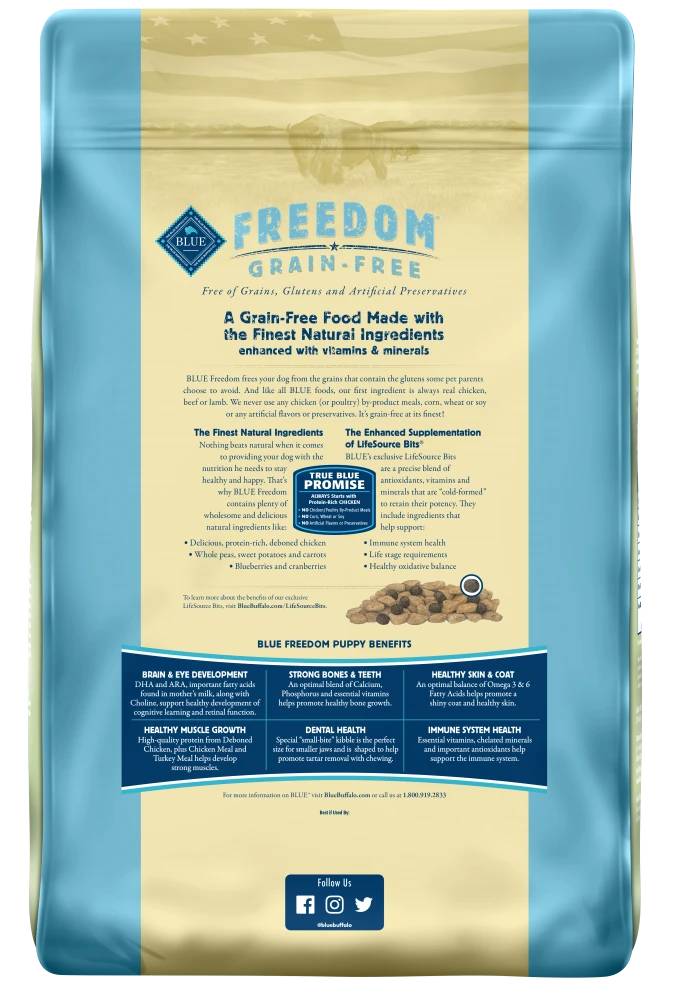 BLUE Freedom® is a delicious, grain free formula that contains no gluten. All BLUE Freedom dog food recipes feature high-quality real meat with no chicken (or poultry) by-product meals. Freedom puppy formula contains ingredients like DHA fatty acid to support your puppy’s healthy growth and development at this important stage in life. BLUE Freedom dog food is a product of the Blue Buffalo company. Based in the United States, Blue Buffalo makes premium-quality pet foods featuring real meat, fruit and vegetables.