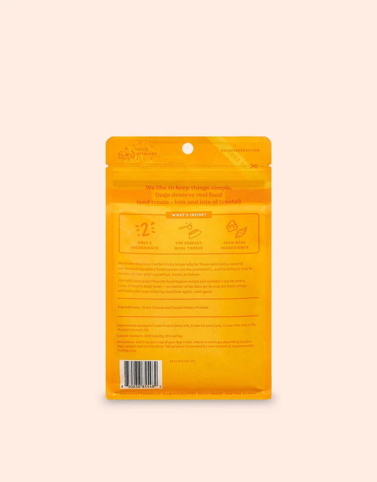 We know mealtime can be tricky (especially for those extra picky eaters!) Our Cheese & Sweet Potato food topper is the yummiest (…and healthiest) way to switch up your pup’s breakfast, lunch, or dinner.