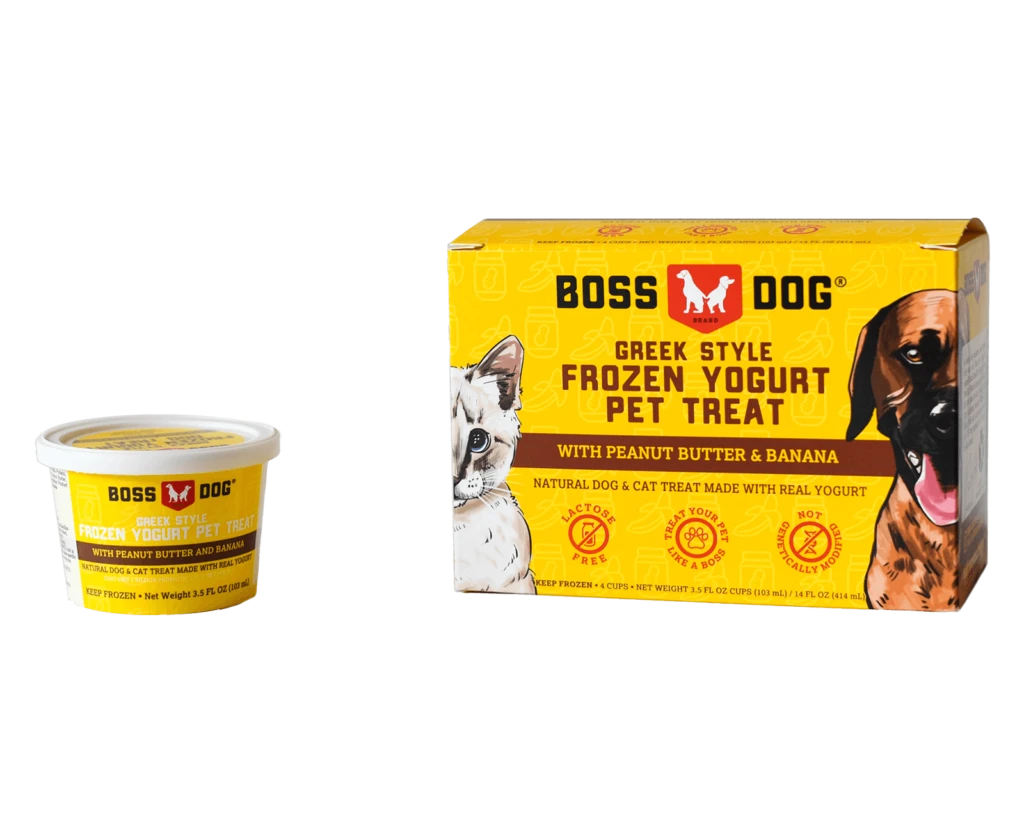 Boss Dog® Brand Greek Style Frozen Yogurt Treats use 100% Human Grade ingredients with flavors that pets love to create an irresistible treat. They will love the combinations of Peanut Butter & Banana, Cheddar & Bacon and Pumpkin & Cinnamon. Be sure to stock your freezer with all three flavors for your pet! These frozen Greek Style Yogurts are a great daily treat. Try them after a walk for a cool down or even for training. Simply open and hold the cup and command away.