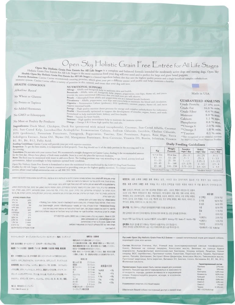 Canine Caviar Open Sky Holistic Grain Free Entrée for All Life Stages is a complete and balanced formula intended for moderately active dogs and nursing dogs. This Duck and Chickpea based kibble is the most nutritious food your dog will ever need and is perfect for medium and large breed puppies.
