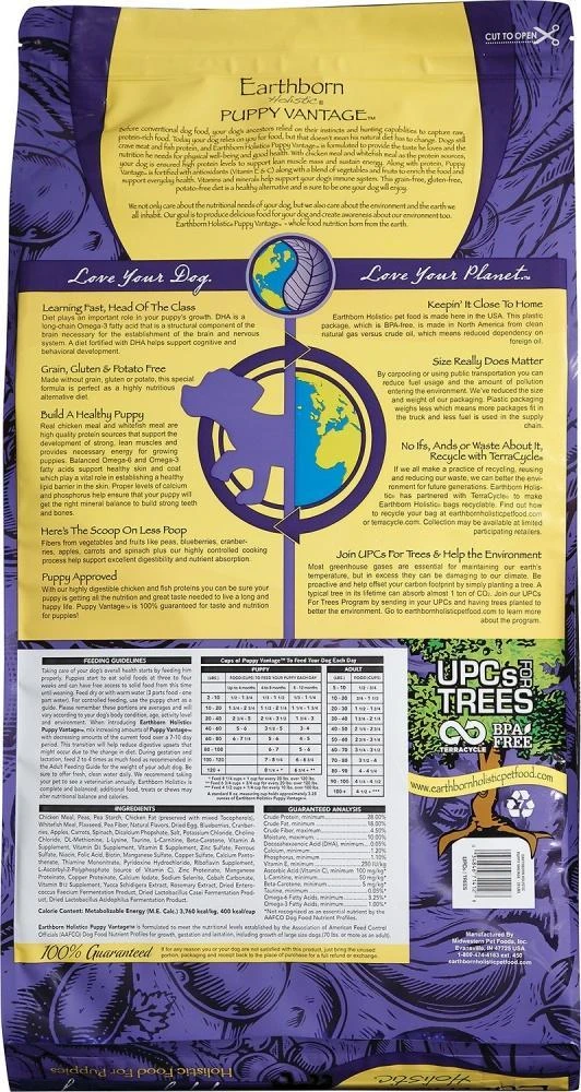 Earthborn Holistic Puppy Vantage is formulated to meet the nutritional levels established by the AAFCO Dog Food Nutrient Profiles for growth, gestation and lactation, including growth of large size dogs (70 lbs. or more as an adult).