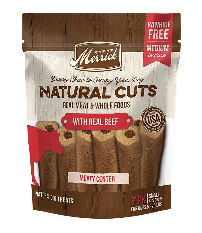 Merrick Natural Cuts are a NEW, rawhide free dog treat designed to occupy your dog with no staining, splintering, or plastic. Made with natural ingredients like real beef and whole foods, these savory dog chews feature a meaty, chewy center your dog will crave.