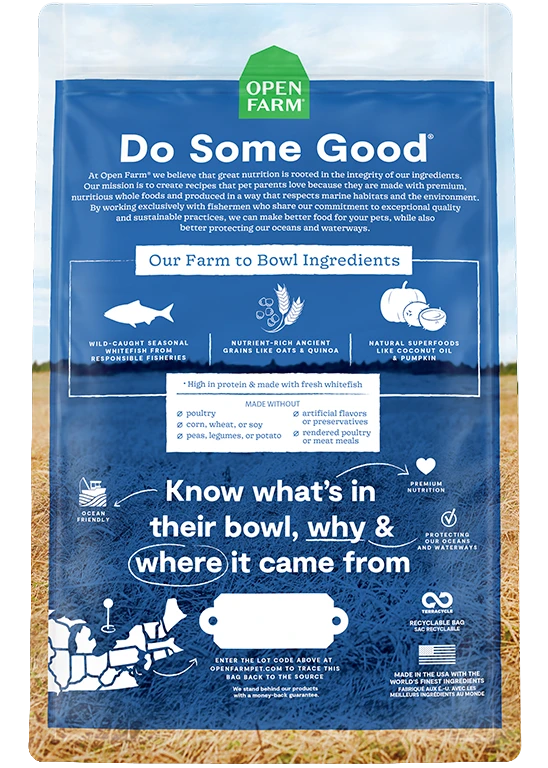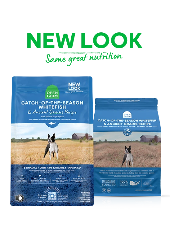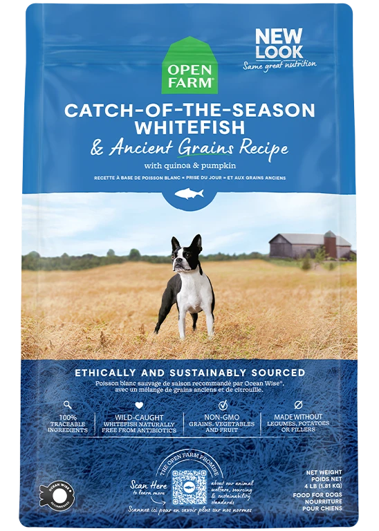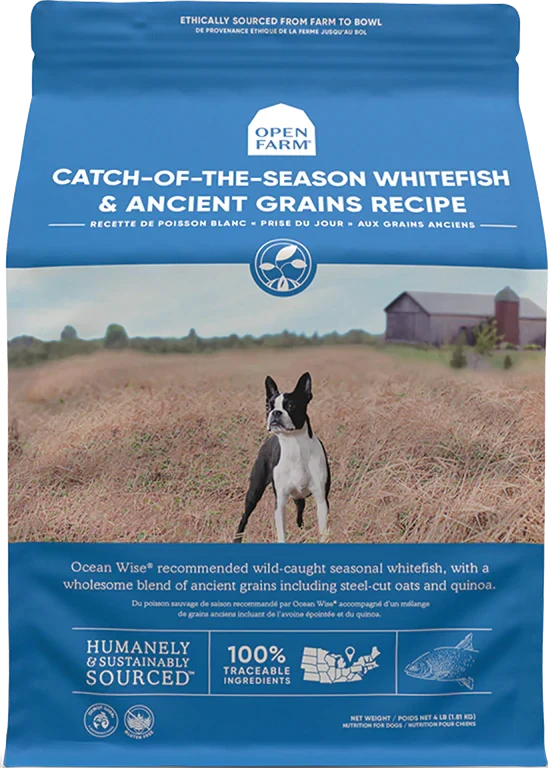 Open Farm Catch-of-the-Season Whitefish & Ancient Grains recipe is formulated to meet the nutritional levels estimated by the AAFCO Dog Food Nutrient Profiles for all life stages except for the growth of large-size dogs (70 lbs or more as an adult).