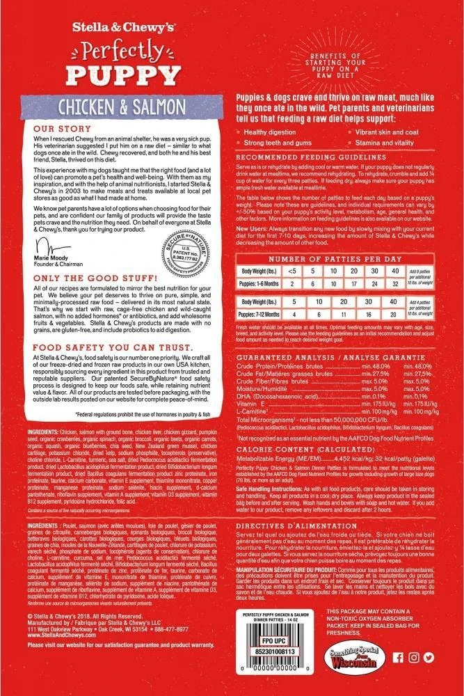 These Perfectly Puppy Chicken & Salmon freeze-dried patties (14 oz offering) are formulated to mirror a puppy’s ancestral diet! There has never been a more convenient way to feed a biologically appropriate raw food diet. We believe dogs deserve to thrive on real, minimally processed food – the way nature intended.