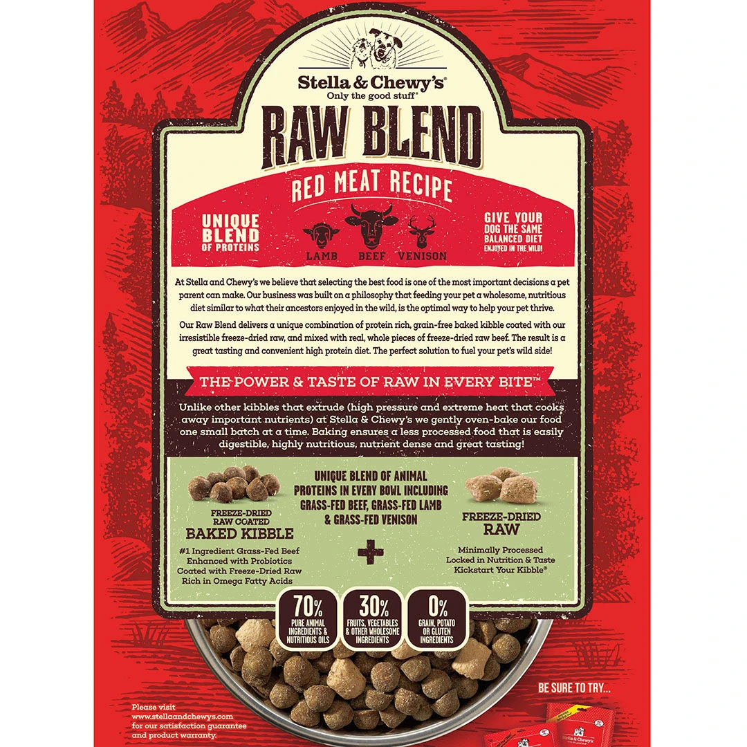 Stella & Chewy’s Raw Blend combines high-protein, grain-free baked kibble coated with our irresistible freeze-dried raw plus our own freeze-dried raw pieces together in the same bag. It’s the perfect marriage of convenience and raw nutrition to give your pet energy, vitality and make mealtime special and fuel your pet’s wild side!