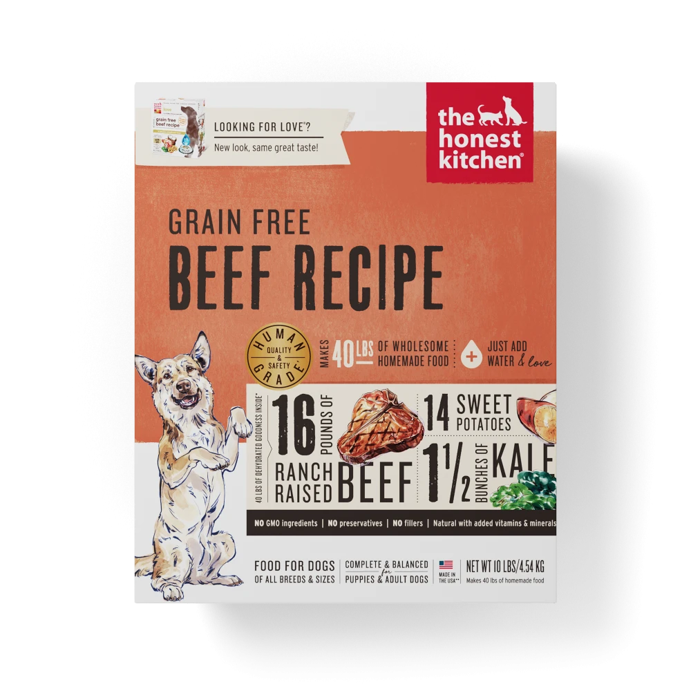 Where’s the beef? It’s right here—maybe you didn’t recognize it without the antibiotics, hormones, GMOs, corn, soy, rice, beet pulp, or wheat. Nothing beats this dehydrated combination: ranch-raised beef plus nutrient-rich producey. Whether for puppies or adult dogs, this meal is a sure win because it’s low-carb, lower calorie, and grain-free—while simultaneously higher in protein. That means you can relax knowing that if anyone ever has beef with your dog, they’re bound to lose.