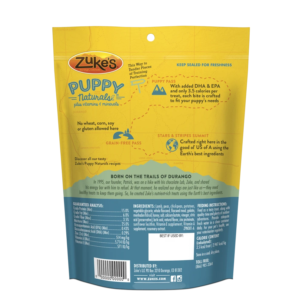 To a puppy, every day is new adventure. There’s so much to learn: Come. Sit. Stay. And, perhaps most important, always do your business outside. Treat your way to a better-behaved puppy with grain-free Zuke’s Puppy Naturals. They’re an ideal, puppy-sized reward for a job well done and a perfect complement to your pup’s playful spirit and developing taste buds. Specially crafted in the USA using the Earth’s best ingredients, they’re made with protein-rich salmon, pork or lamb, plus added DHA and EPA to help support puppy’s healthy brain development. Mighty impressive at just 3.5 calories per treat.